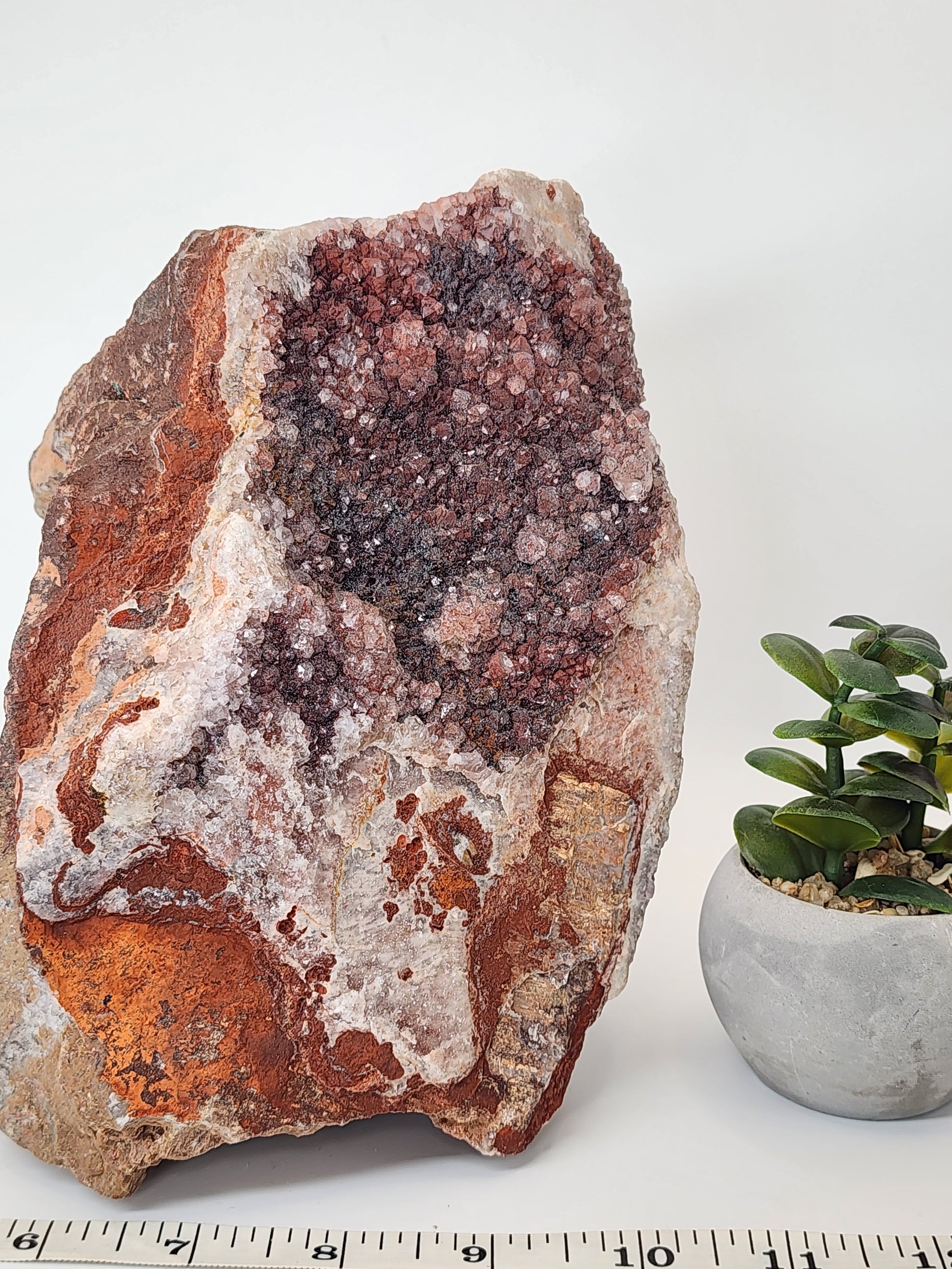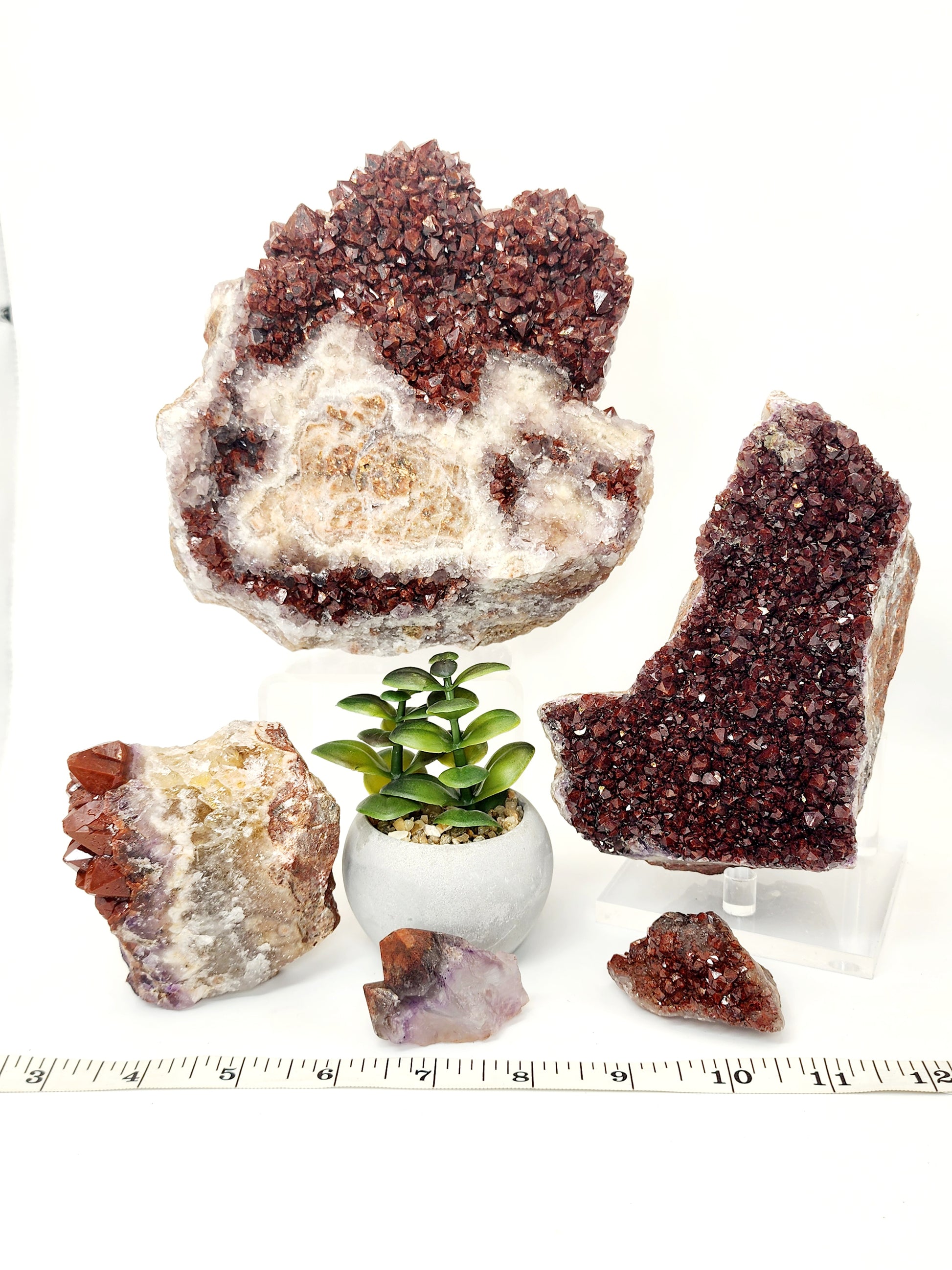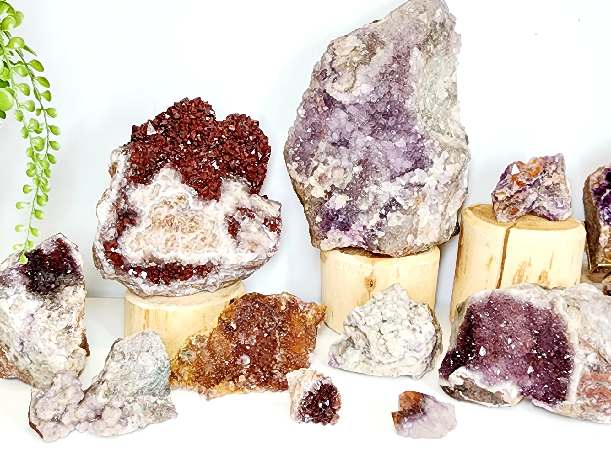 Red Amethyst: Striking deep red crystals enhanced by natural hematite inclusions.