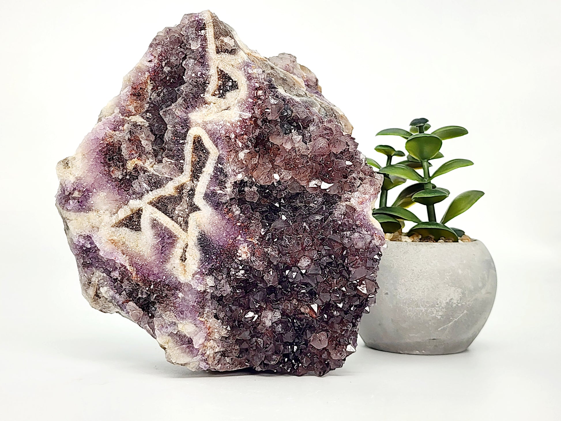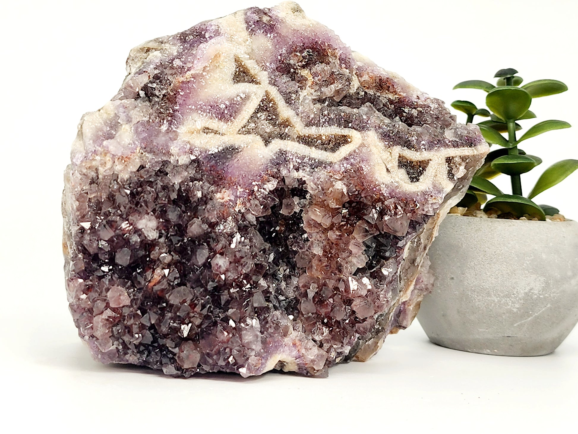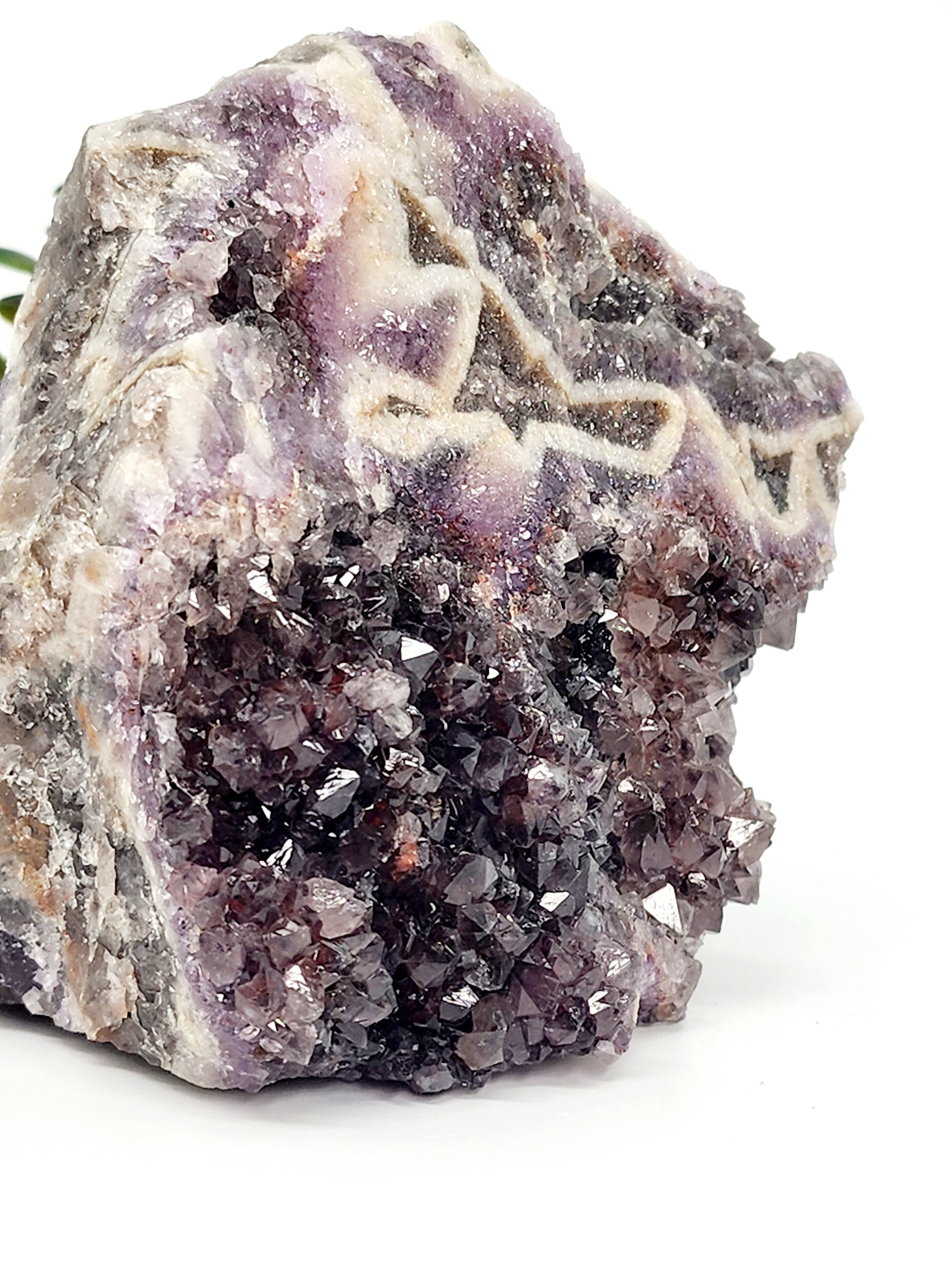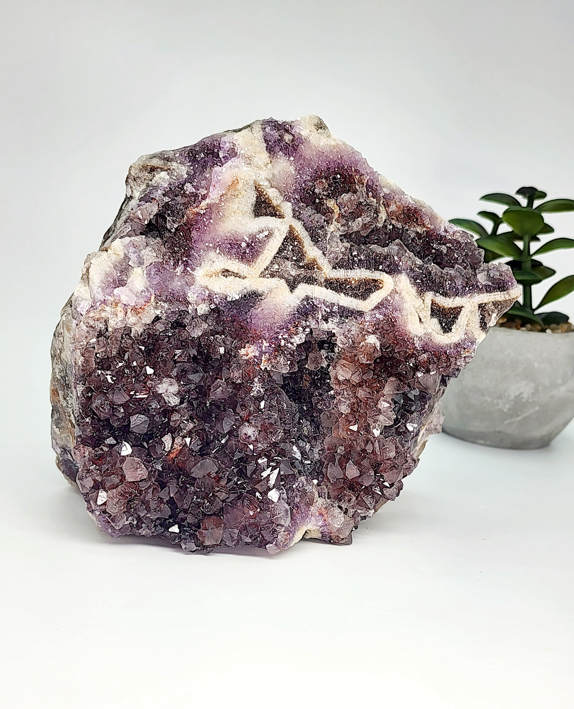 This specimen is an extraordinary Chevron Phantom Amethyst, a rare combination of aesthetic beauty and geological intricacy. The deep purple points hold a captivating clarity, contrasted by hematite inclusions that form small red phantom points within the crystal structure—a phenomenon rarely seen in Thunder Bay amethyst. Encasing the black smoky amethyst is a dramatic white chevron pattern, naturally etched by millennia of geological activity. These features combine to create a visually stunning and energetically potent piece that speaks to both collectors and healers.
