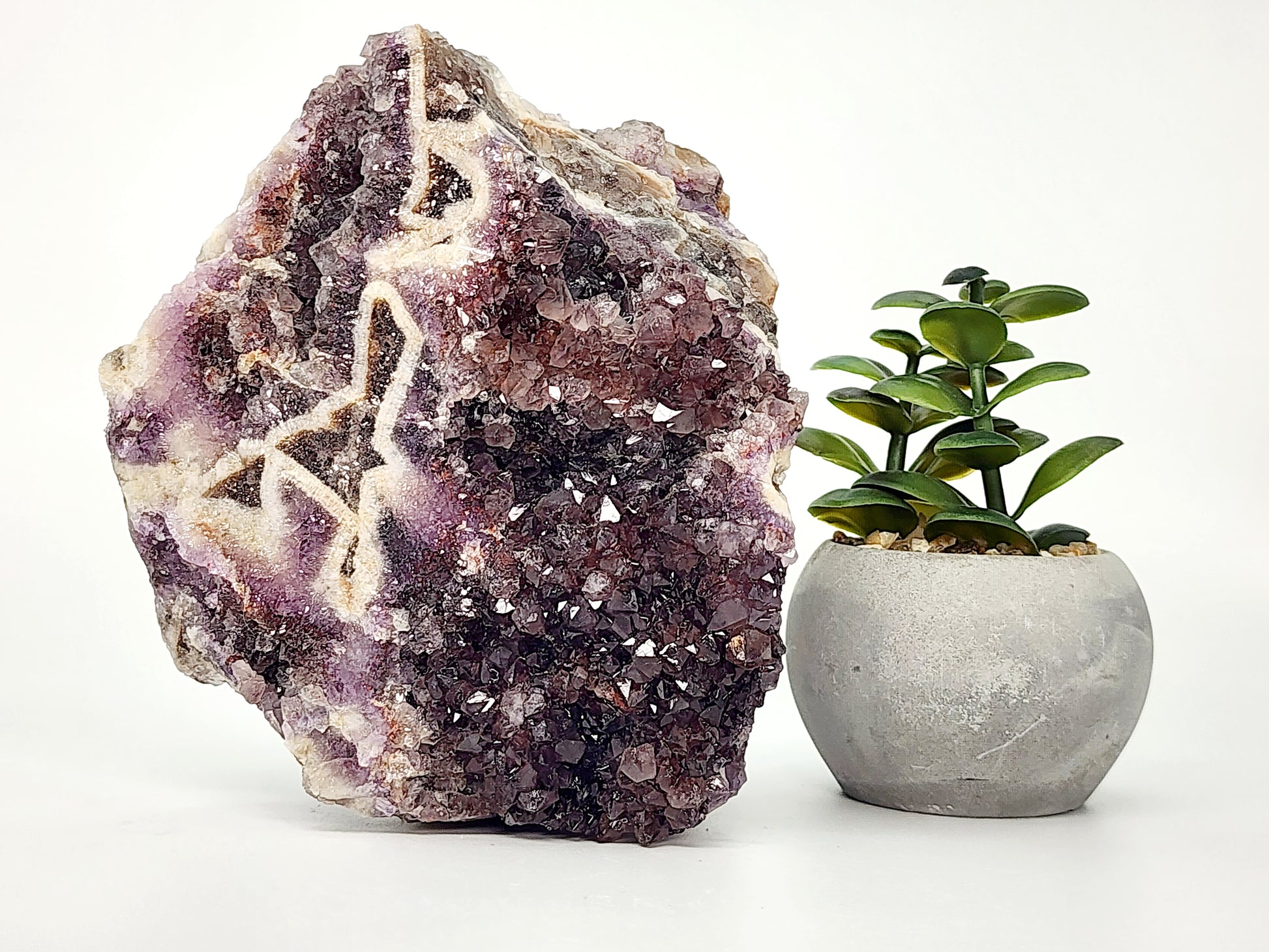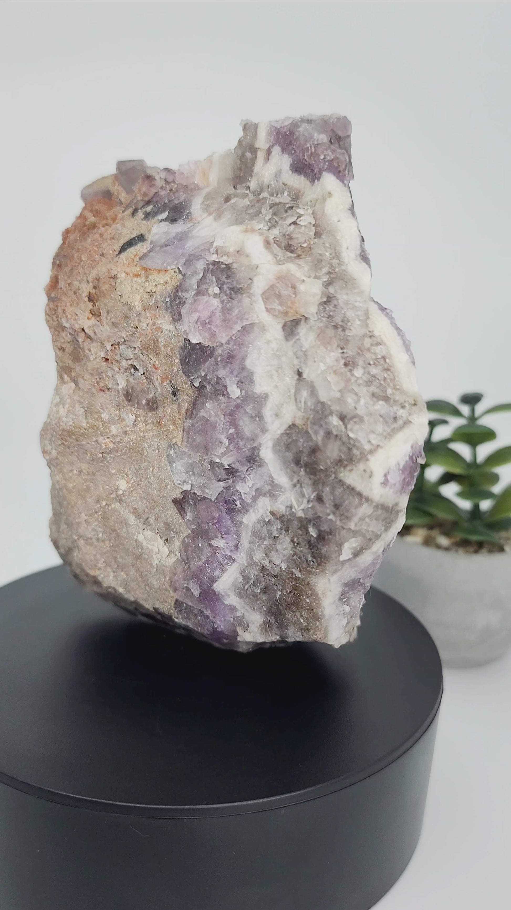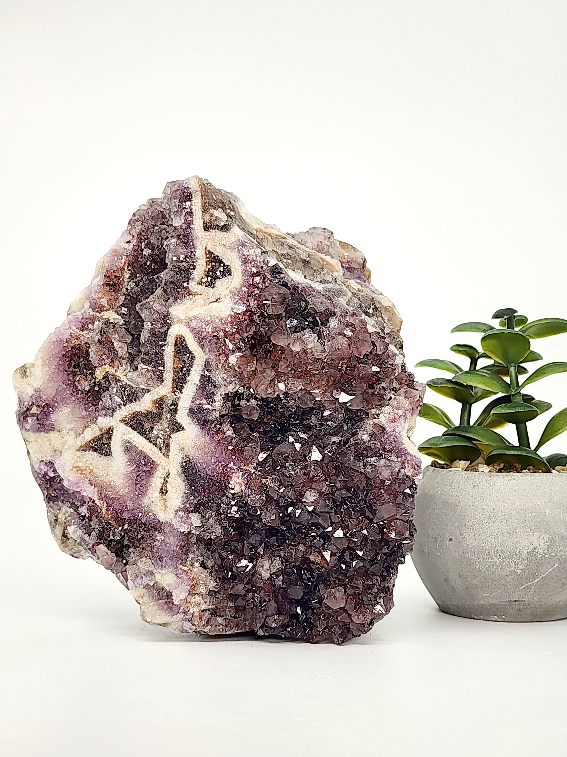 Chevron Phantom Amethyst is said to amplify spiritual awareness and inner vision while supporting clarity and grounding. The hematite phantoms add an additional layer of grounding energy, making this piece ideal for those seeking balance and transformation. Smoky amethyst is believed to dispel negativity, and the chevron patterns are thought to guide energy flow and promote spiritual alignment. This crystal is perfect for meditation, chakra work, or as a centerpiece for any energetic practice.