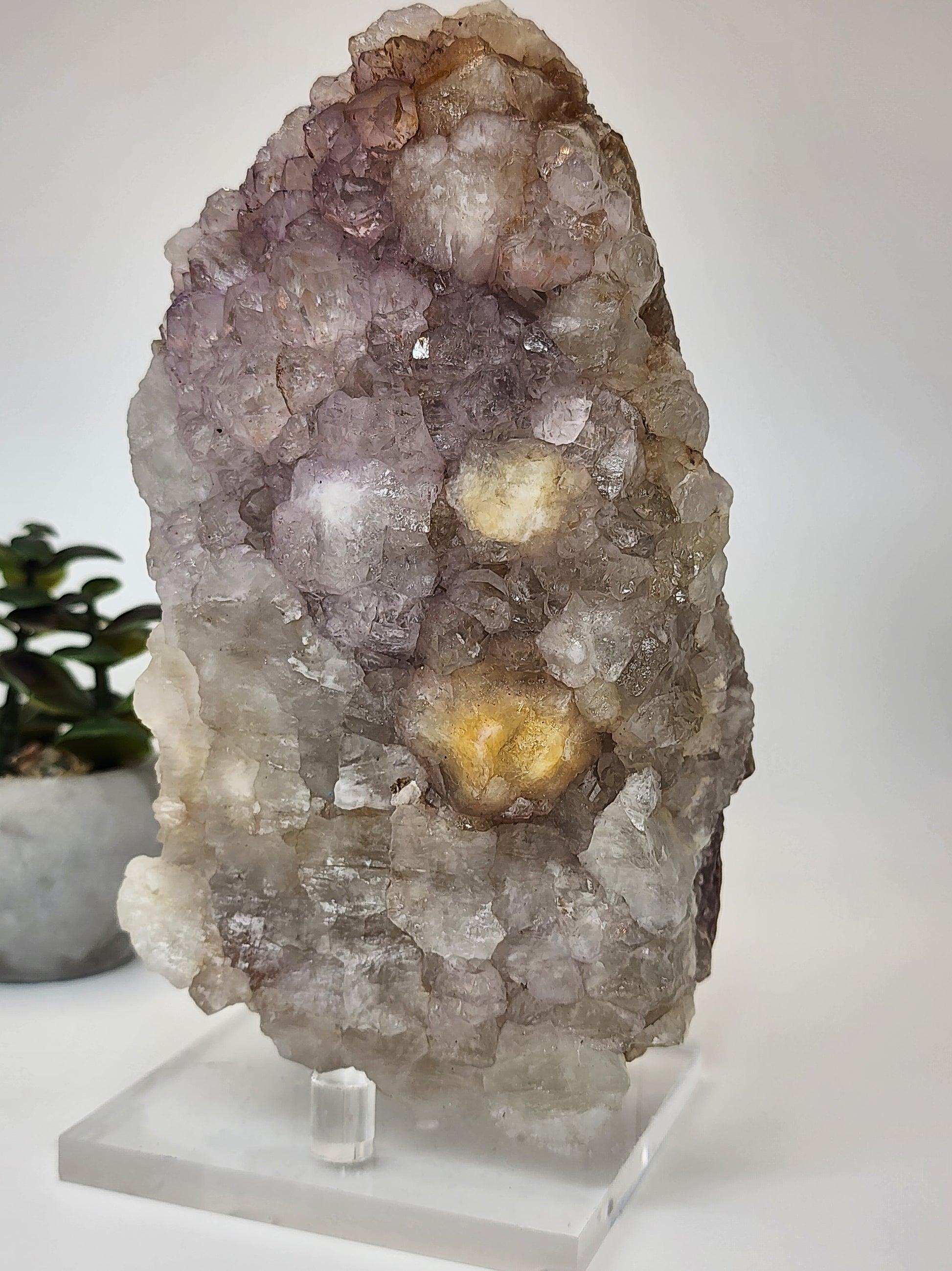 This captivating piece combines the serene beauty of amethyst with the vibrant energy of natural citrine points, a unique formation created by variations in mineral content during crystallization. The citrine points add a warm, golden hue to the specimen, making it visually striking and geologically rare. The blend of purple and yellow tones results from the natural transformation of amethyst into citrine, providing a perfect harmony of two powerful quartz types in one specimen. Collectors highly value this natural combination for its aesthetic appeal and rarity.