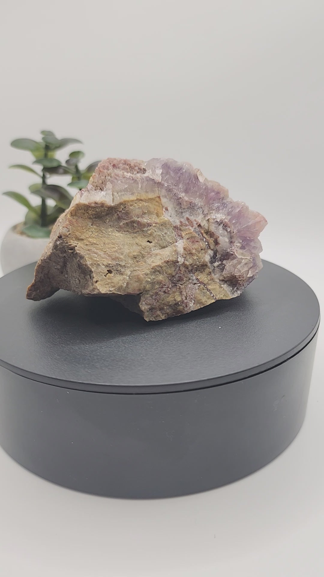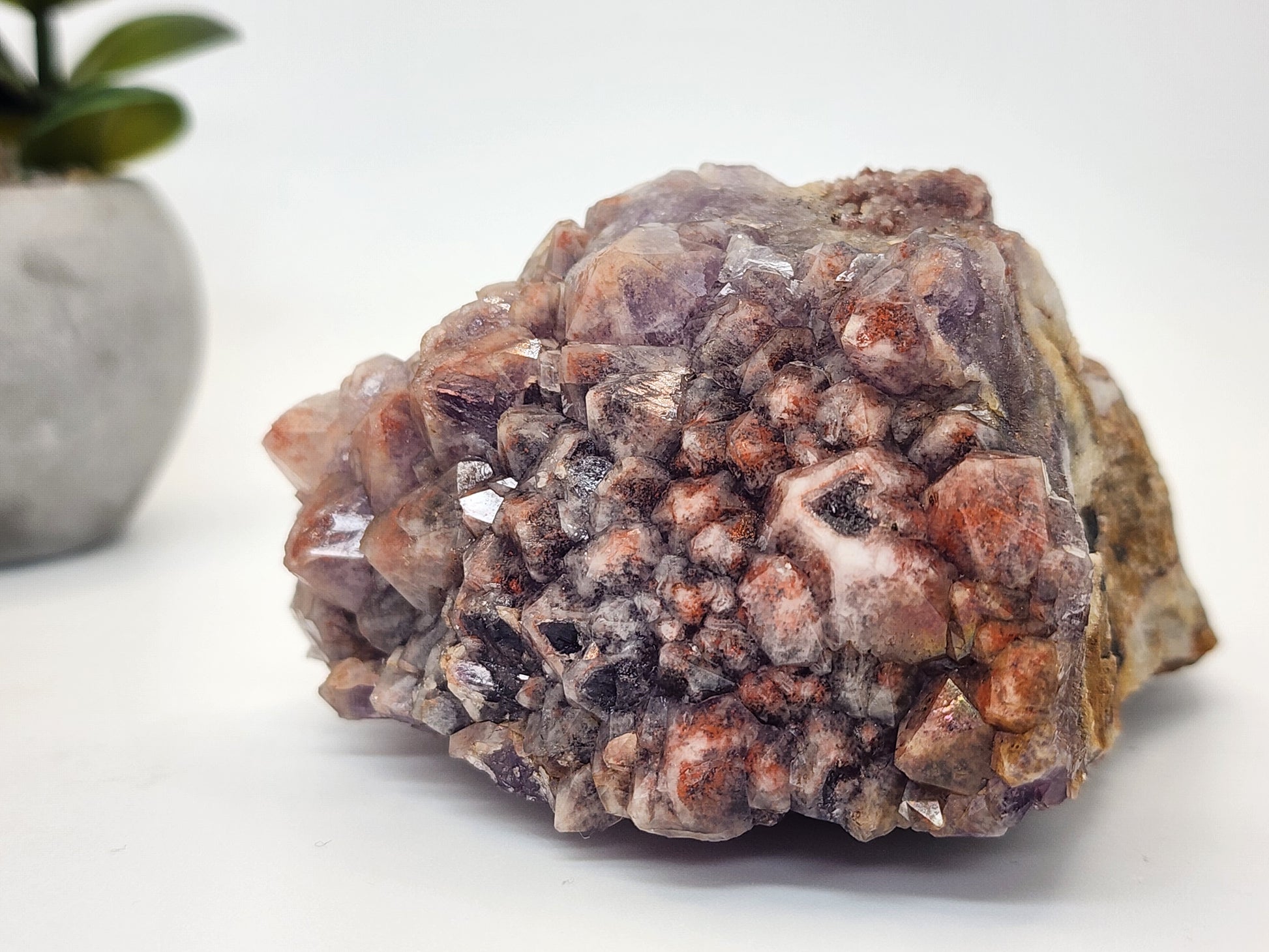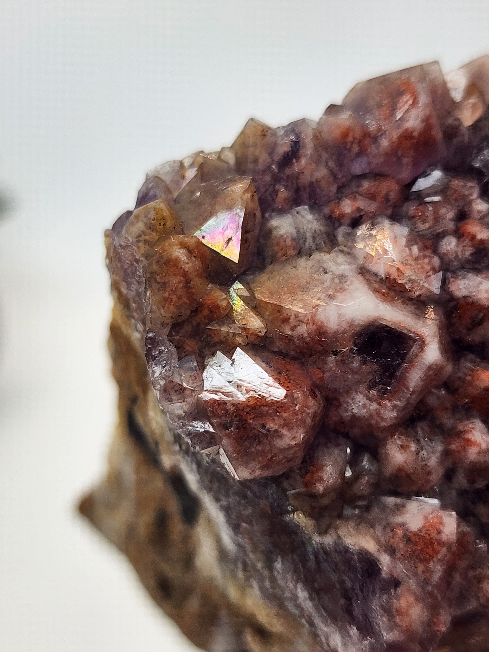 This stunning piece features a rare combination of purple amethyst with striking pink inclusions, created by a unique mix of minerals found only in this region. These minerals—including iron oxide, manganese, and others—give the stone its distinctive coloration. A truly rare feature of this piece is the natural iridescent luster found in one corner. While the exact cause of this phenomenon is not fully understood, it is believed to be the result of a natural metallic coating, possibly involving aluminum or other elements, creating an ethereal, rainbow-like sheen that adds to its collectible value.